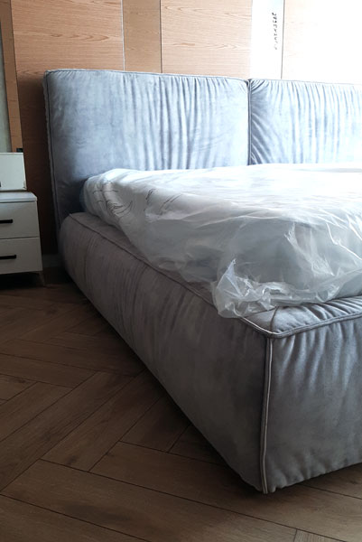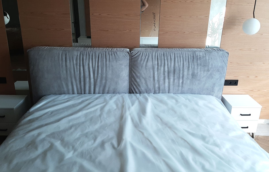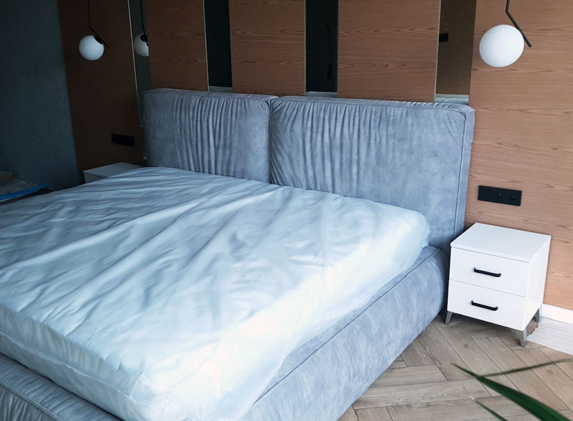 Заказчики хотели кровать, которая сочеталась бы с интерьером спальни и была комфортной. Старая мебель не подходила по цвету и текстуре, поэтому решили заказать кровать на изготовление с мягкой тканевой обивкой серого цвета.